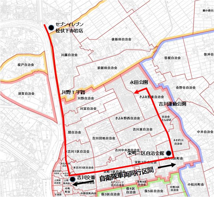 - 午後1時10分から午後1時35分 吉川交番前交差点から栄町三区自治会館南側交差点(自衛隊車両同行区間)