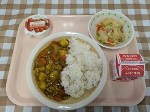 【中学校】ご飯 牛乳 和風チキンカレー キャベツのソテー お祝いデザート