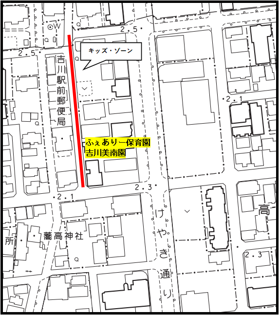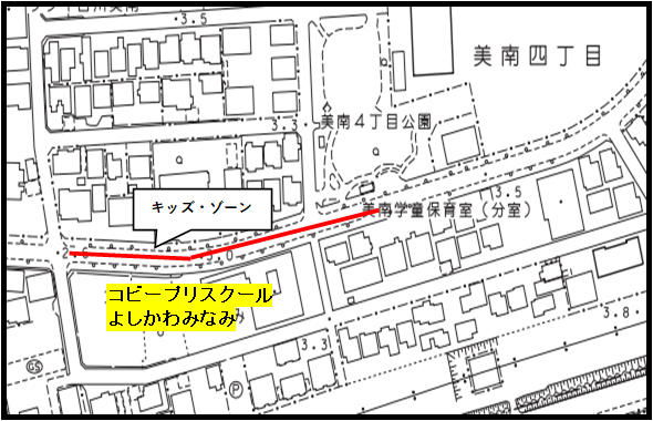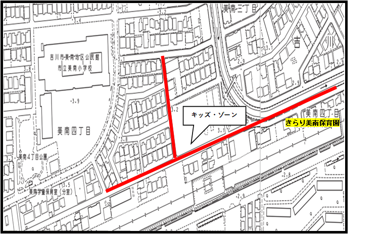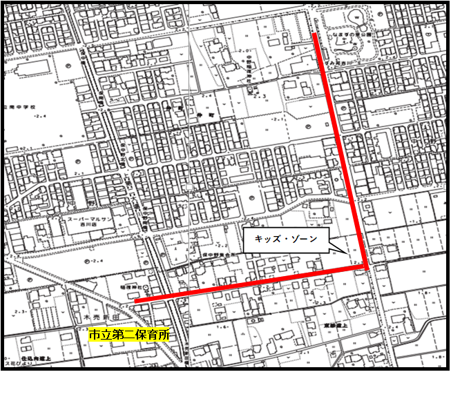 市では、保育施設から報告のあった散歩経路上の危険箇所のうち、警察等の関係機関と点検や協議を行い、キッズ・ゾーンとして設定しました。