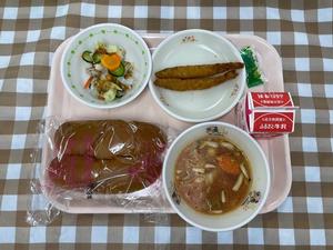 【中学校】ぶどうパン 牛乳 チキンブロス フランクのケチャップソース もやしのカレーソテー