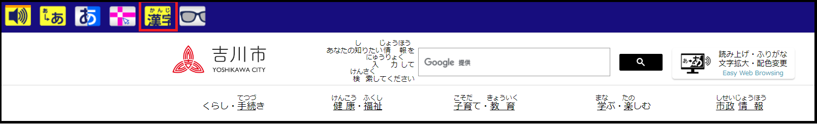 クリックするとページの上にボタンが表示されるので、漢字と書かれたボタンをおすと、ふりがなをふることができます。