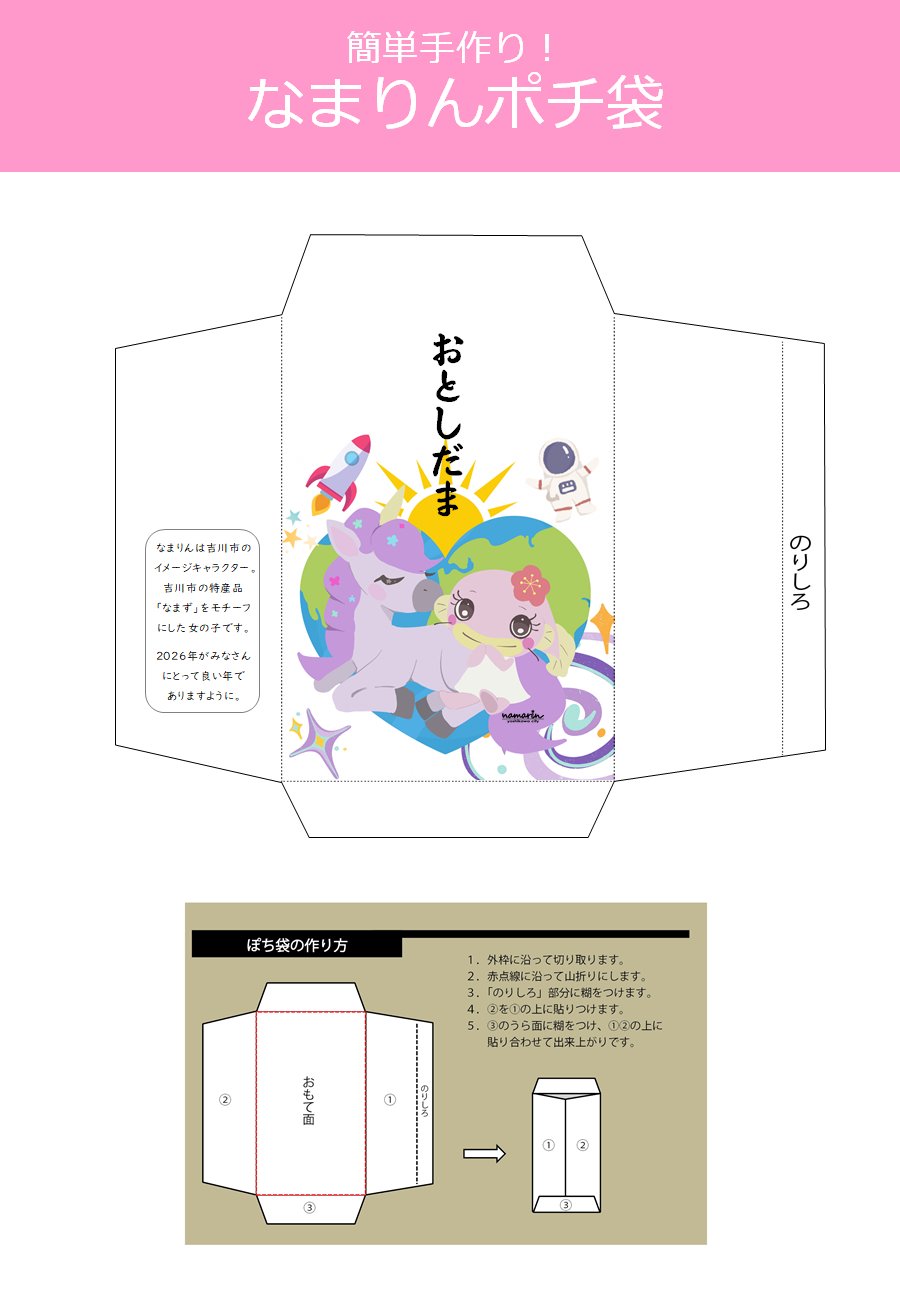 「なまりん年賀状」と「なまりんポチ袋(おとしだま袋)」が、ご自宅のプリンターで簡単に作成できます。